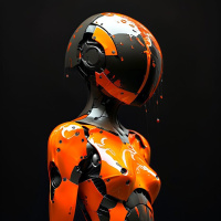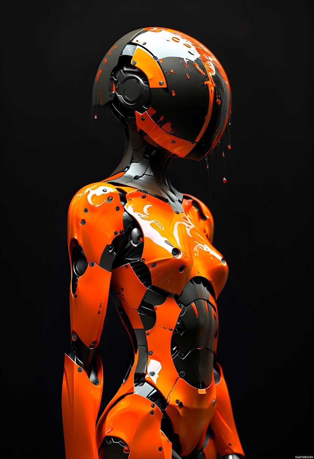 На картинке изображен робот, выполненный в виде женского гуманоида. У робота оранжево-красная цветовая гамма с металлическими акцентами. Его голова круглая, а на передней части расположены то ли камеры, то ли сенсоры. У него две руки, заканчивающиеся конструкциями, похожими на кисти, с механическими пальцами.
