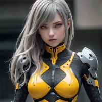 The image depicts a person standing outdoors. The individual has white hair and wears a sleek, futuristic suit that combines black and yellow materials with visible mechanical details suggesting a science fiction theme. The suit's design includes armor pieces on the arms and torso, and the overall appearance is quite striking. The setting appears to be an urban environment during daylight hours.