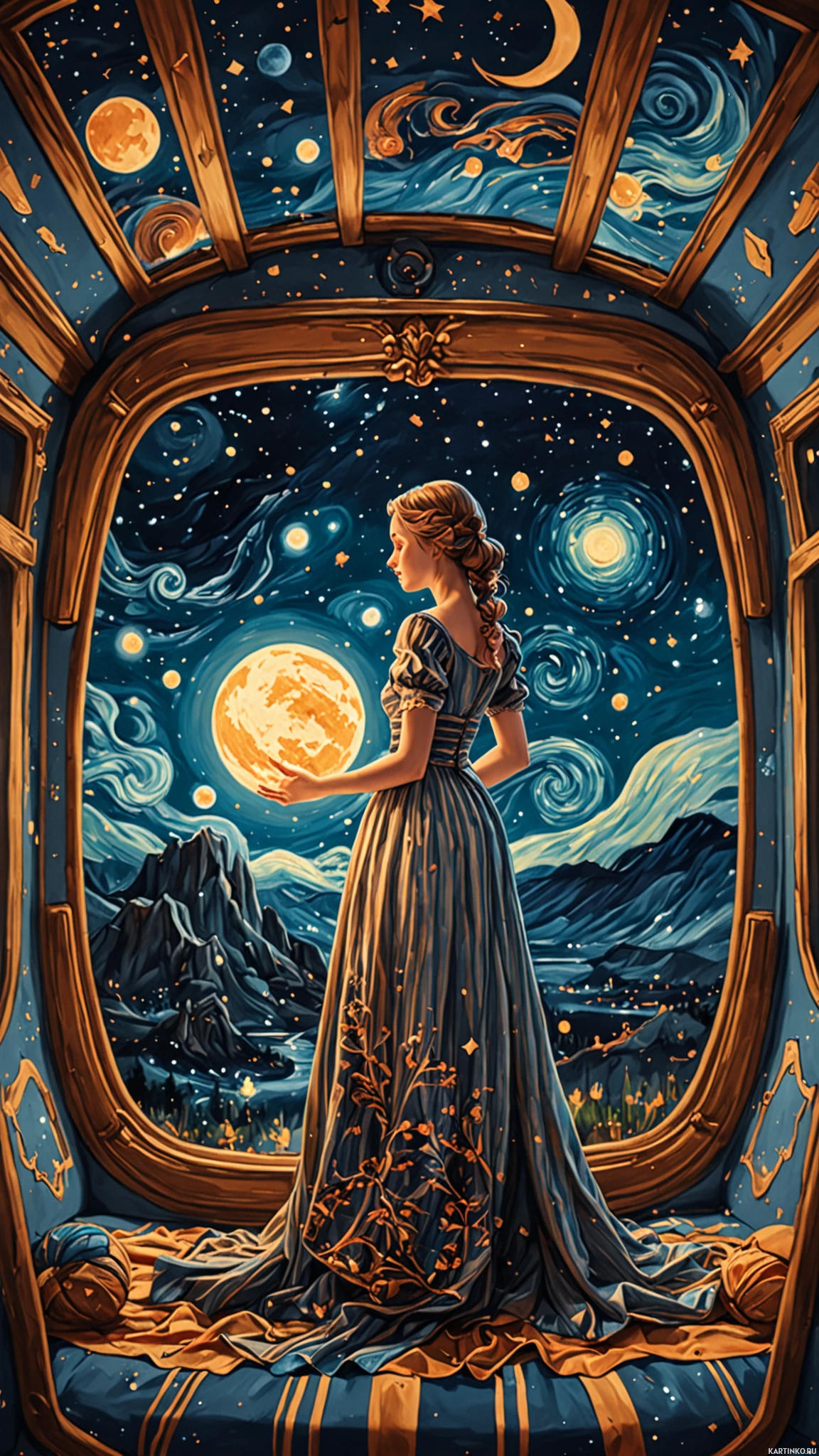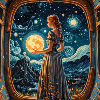 soft focus on the girl and the intricate details in her dress, contrasting with the sharpness of the night sky background.