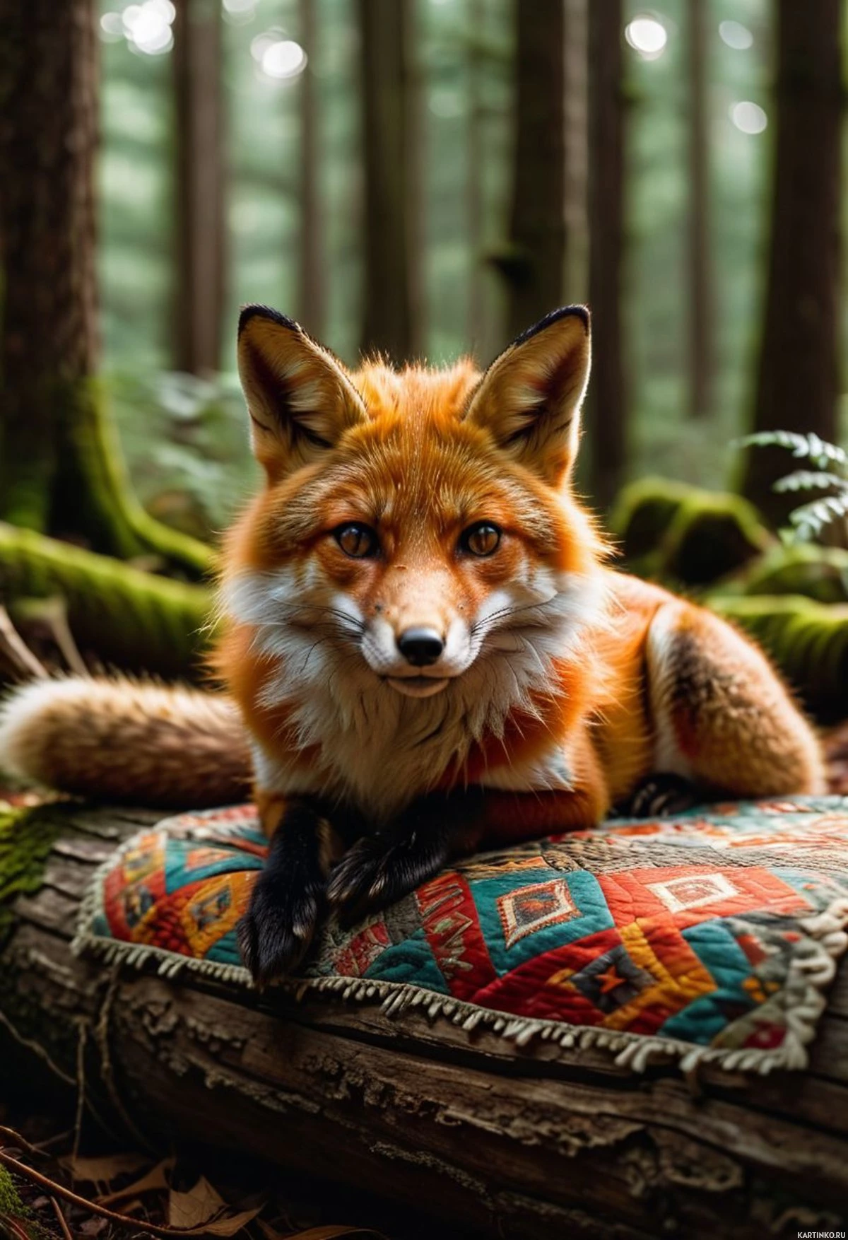 В центре картинки – рыжий лис с более светлым оранжевым оттенком на голове и ушах. Он смотрит прямо в камеру с мягким выражением морды. У него длинная пышная шерсть, которая выглядит пушистой и ухоженной. Лис находится в спокойном лесном пейзаже. Вокруг высокие деревья разных оттенков зеленого, на некоторых из них растет мох, создавая естественный навес. Почва под лисом покрыта опавшими листьями и ветками, что создает ощущение тихого, уединенного места. На переднем плане – большой кусок ткани с замысловатым узором в оттенках красного, оранжевого и желтого, что контрастирует с естественными цветами леса. Ткань выглядит как одеяло или ковер, добавляя нотку домашнего уюта в дикую обстановку. Общее освещение мягкое, отбрасывающее легкие тени и подчеркивающее текстуру шерсти лиса и детали окружающего леса.
