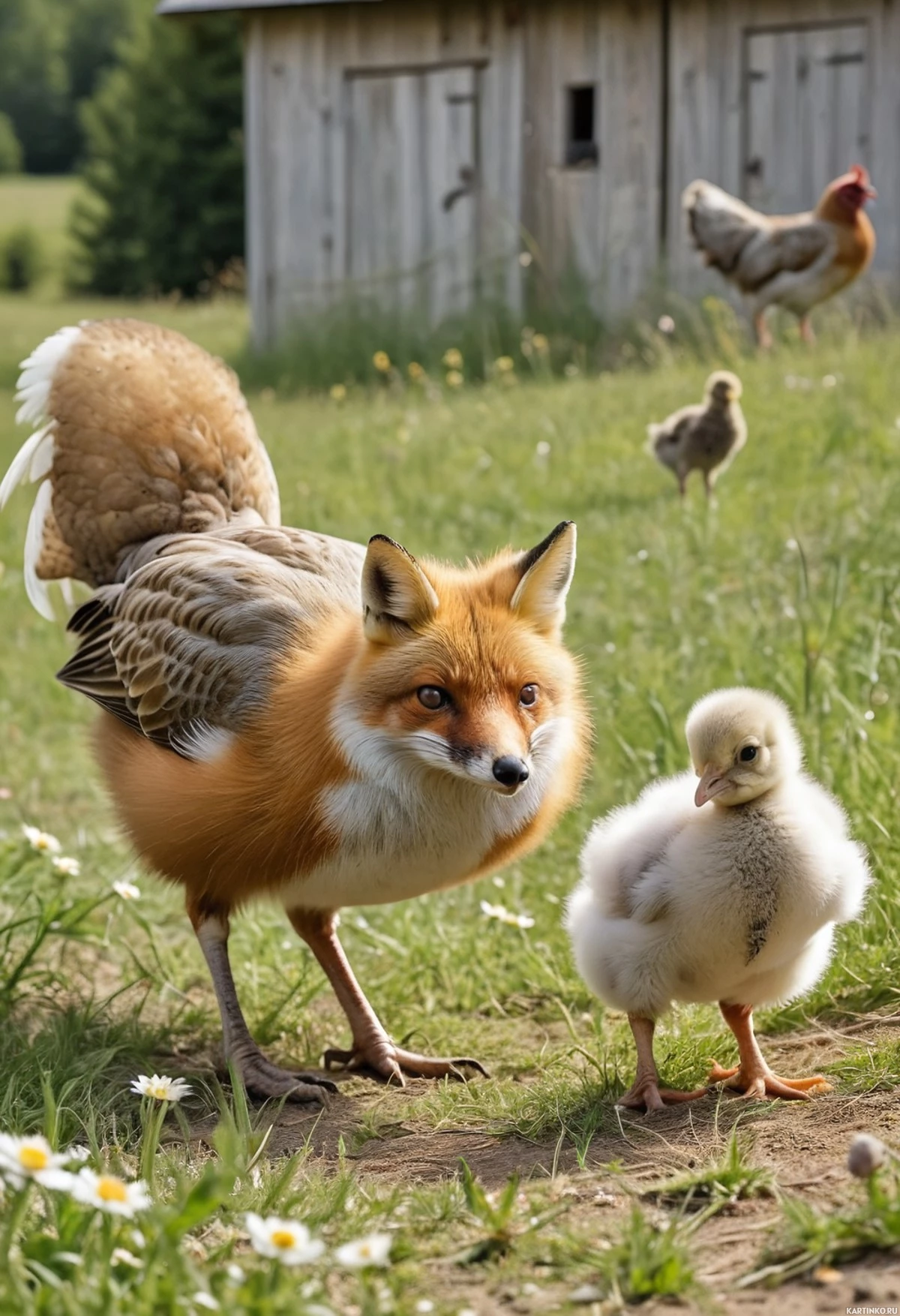 The image depicts a fox with distinctive fur that appears to resemble a chicken, standing amongst real birds in an outdoor setting. There is one chicken and three birds in the background. The fox has prominent features such as long ears, dark eyes, and a bushy tail. Its fur pattern mimics the plumage of a chicken with shades of brown and white, giving it a unique appearance that blends into its surroundings. The setting seems to be a field with grass and some trees in the distance.