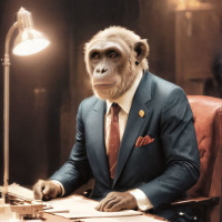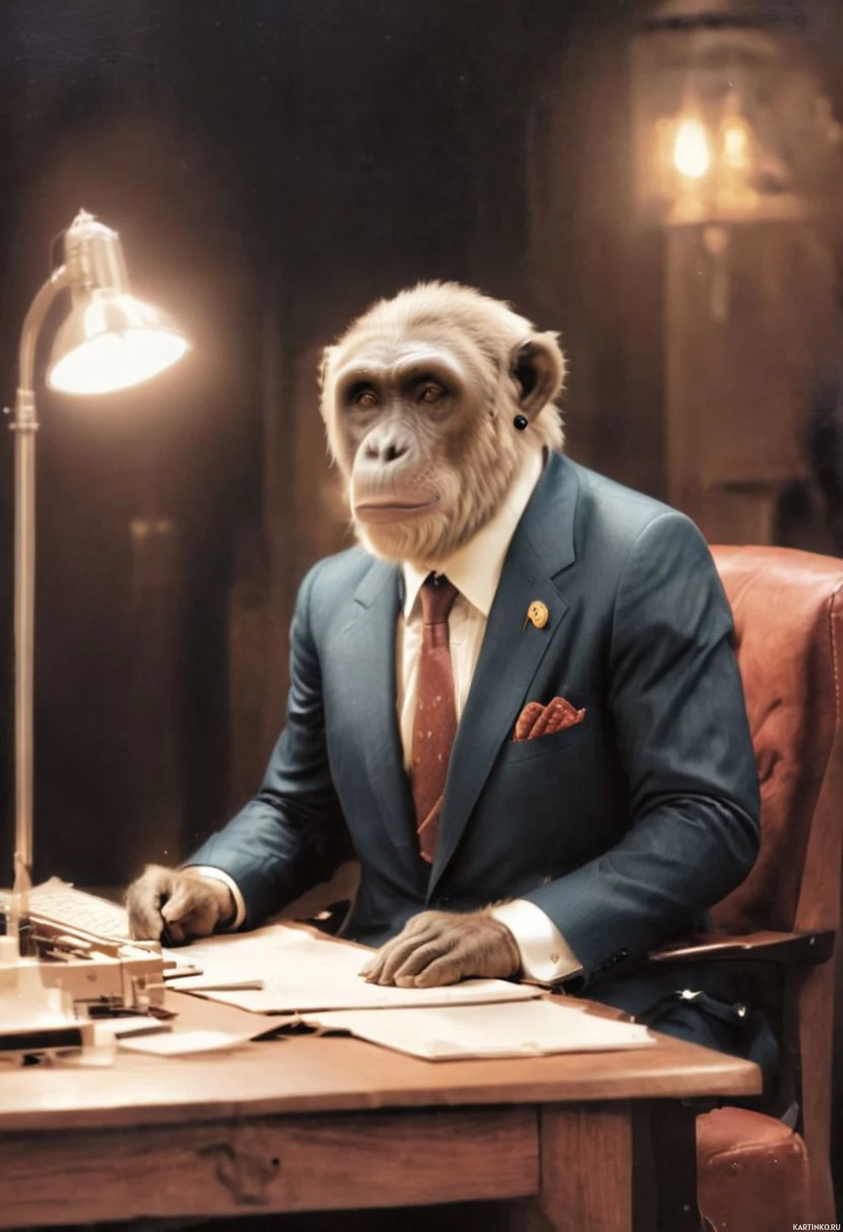 На картинке изобрана обезьяна, сидящая за столом в офисном кабинете. На ней формальный костюм с галстуком. На столе перед ней – бумаги, а настольная лампа освещает сцену. Фон указывает на внутреннее пространство с архитектурными деталями, которые могут намекать на историческую или величественную обстановку.