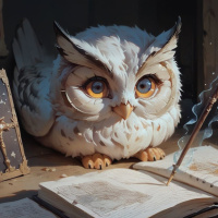 На картинке изображена сова, словно сидящая за столом или рабочим местом, заваленным различными предметами. У нее большие, выразительные глаза, и она кажется сосредоточенной на чем-то за пределами кадра. Вокруг нее книги, что указывает на ученое или магическое окружение. Рядом лежат бумаги и перо, возможно, это говорит о том, что сова что-то пишет или изучает. Общая атмосфера картинки передает ощущение тихой сосредоточенности и интеллектуальных поисков.