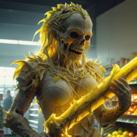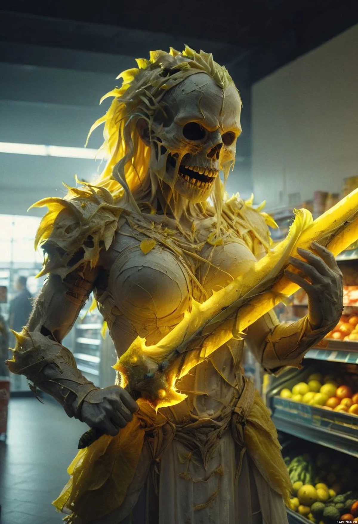На картинке изображён персонаж, словно смесь скелета и древнего воина, с элементами ужаса и фэнтези. Центральная фигура имеет человеческую форму, но голова и грудная клетка напоминают череп скелета, что контрастирует с золотой броней: нагрудник, перчатки и шлем с богатой отделкой. Существо держит светящийся меч, сделанный, кажется, из жёлтых сладостей. Фон размыт, но указывает на интерьер, вероятно, супермаркет или продуктовый магазин, что подтверждается полками, заполненными разнообразными продуктами, такими как фрукты и овощи.