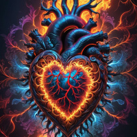 The image features a stylized graphic with a heart at its center. This central heart has two additional hearts embedded within it, creating a layered effect that resembles the inside of a heart's chamber. Surrounding this central design are various elements that seem to be depicting the effects of electrical currents or lightning strikes on the heart. These include lines and sparks emanating from the top right and left corners, suggesting energy flow or disruption. The background is dark, which contrasts with the vivid colors used in the graphic. The color scheme includes a mix of red, blue, yellow, and purple hues, adding to the dramatic and intense atmosphere of the image.