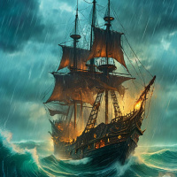На картинке изображен пиратский корабль в бурном море во время грозы. Корабль выделяется на переднем плане, с его высокими мачтами и парусами, надутыми ветром. С палубы вырываются языки пламени, намекая на то, что корабль горит или подвергается нападению. На заднем плане нависают темные грозовые тучи над вздымающейся белой пеной. Вспышки молнии справа освещают сцену, добавляя драматизма и подчеркивая опасность происходящего.