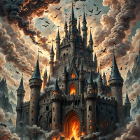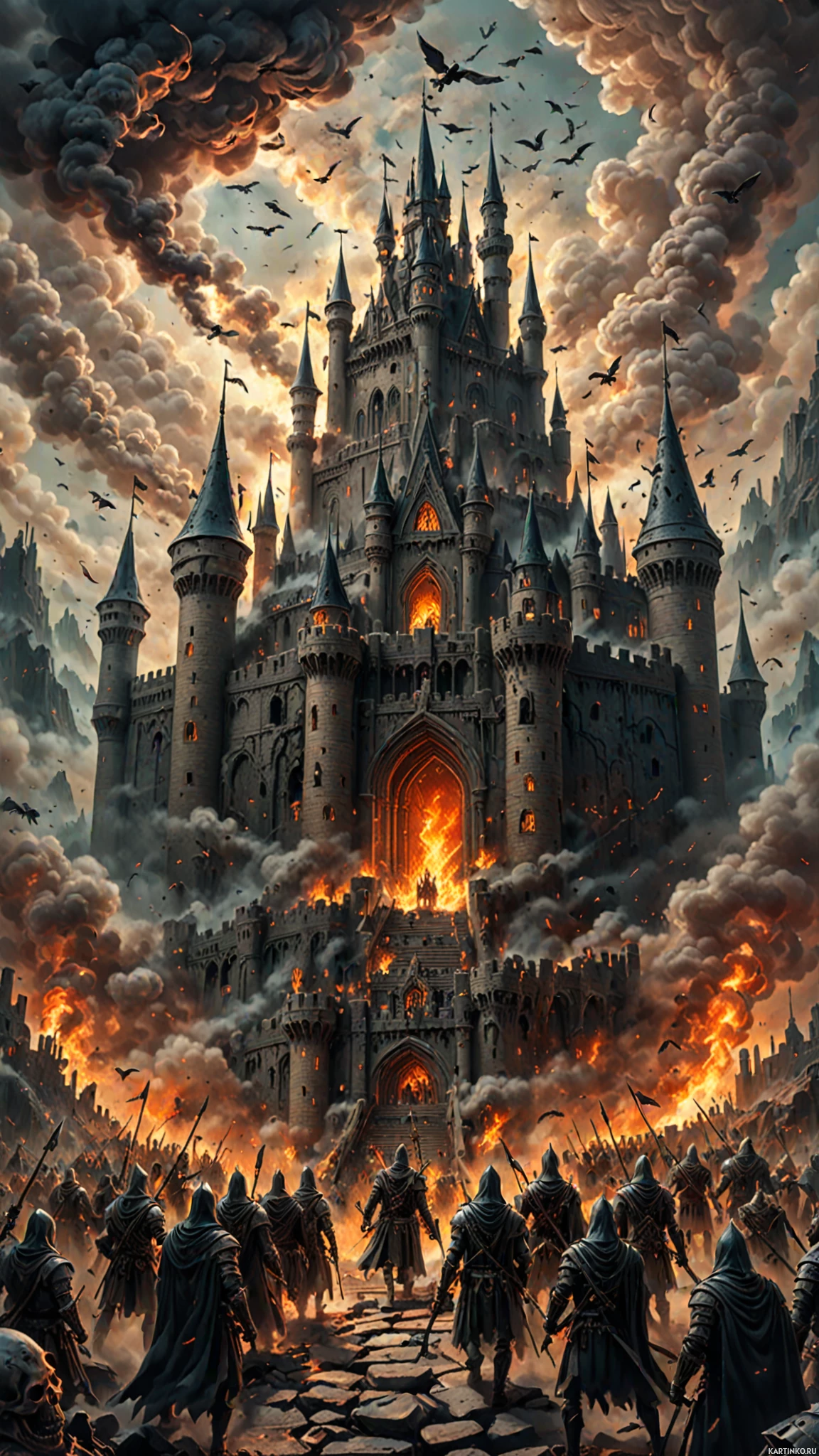 На картинке величественно возвышается большой замок на переднем плане, с множеством башен и зубцов. Архитектура замка отличается сложной отделкой, с остроконечными крышами и арочными окнами, характерными для готического стиля. Из окон и дверей замка вырываются языки пламени и дым, создавая атмосферу бушующего огня. Над замком нависает огромное облако темного дыма, подчеркивающее драматическую и зловещую атмосферу. У подножия замка на булыжной мостовой собралась группа рыцарей в доспехах, с обнаженными мечами, словно готовящихся к битве. На их шлемах видны гербы, добавляющие им царственного вида. Сцена залита мягким светом солнца, пробивающегося сквозь дым, создавая неземное сияние на рыцарях и выделяя детали замка.