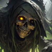 The image depicts a fantasy creature resembling a skeleton with glowing red eyes and a dark hooded cloak draped over its head. It is set against a backdrop of volcanic activity with lava flowing down from above, suggesting destruction or danger. The overall tone of the artwork conveys a sense of horror and apocalyptic disaster.