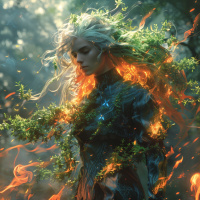 На картинке изображена персонаж, похоже, женщина с белыми волосами и закрытыми глазами. На ней доспехи в фэнтезийном стиле, с элементами, напоминающими растения или мох, на груди. Вокруг головы и плеч – языки пламени и искры, создающие ощущение магической обстановки. Выражение лица персонажа задумчивое. На заднем плане – деревья и земля, напоминающая вулканическую или застывшую лаву.