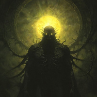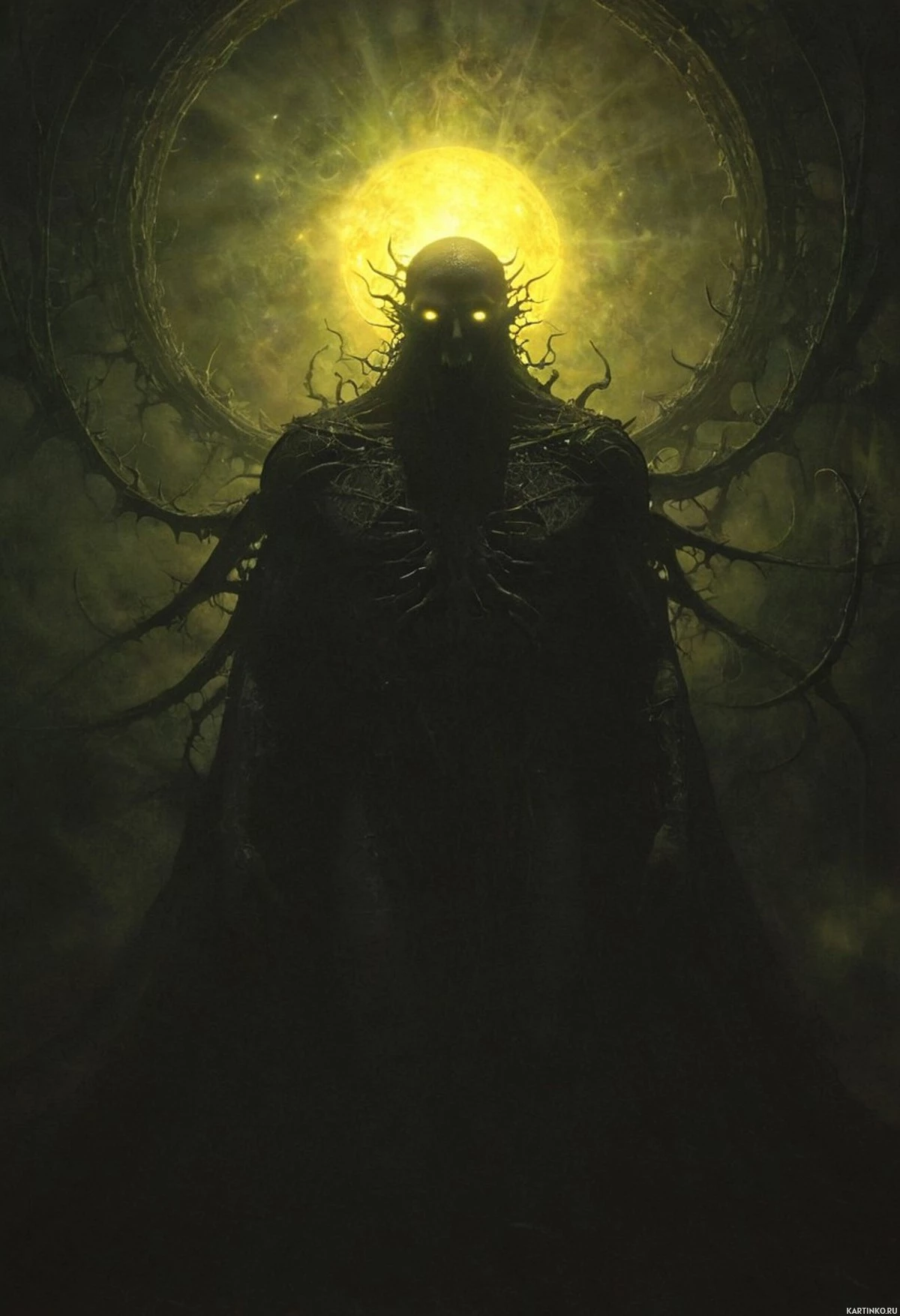 На картинке, в самом центре, возвышается зловещая фигура, окутанная неземным светом, резко контрастирующим с темным фоном. Фигура облачена в одеяния и доспехи, что придает ему внушительный вид. Лицо скрыто маской, усиливающей его угрожающее присутствие. Правая рука поднята, словно он что-то колдует или контролирует. Вокруг центральной фигуры множество светящихся рун, вырезанных в темноте, создающих атмосферу таинственной силы и древней загадки. Общая композиция напоминает сцену из фэнтезийного хоррора.