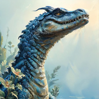The image depicts a fantastical scene featuring an anthropomorphic crocodile standing upright on its hind legs with its front arms raised above its head. The crocodile has scales in shades of blue and green, with a more detailed pattern visible on the body, suggesting a scale-like texture. It appears to be situated near a body of water, possibly a lake or sea, as there are elements such as waves and a small boat. Surrounding the central figure are green plants and what looks like a rocky terrain that could be part of a mountainous landscape. The sky is depicted with light shining through the trees, suggesting a time around dawn or dusk due to the soft illumination.