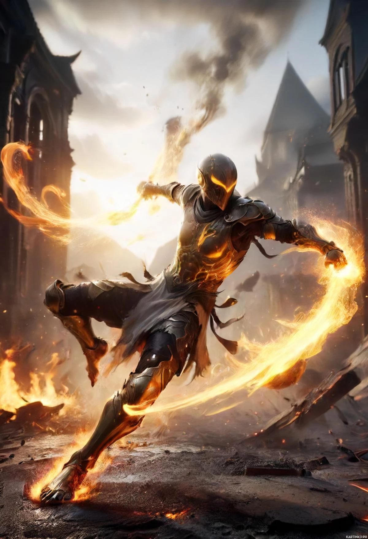 На картинке запечатлён персонаж в стиле фэнтези, полный решимости. Воин изображён в золотых доспехах и с посохом, увенчанным пламенем, что намекает на магическую силу или власть над стихиями. Волосы у персонажа зачесаны назад, и он сосредоточен на предстоящей задаче. На заднем плане видны руины древнего города, полуразрушенные каменные строения и, похоже, тлеющие остатки недавнего сражения. Цвета насыщенные и яркие, передающие атмосферу интенсивности и эпического повествования, характерную для жанра фэнтези.