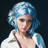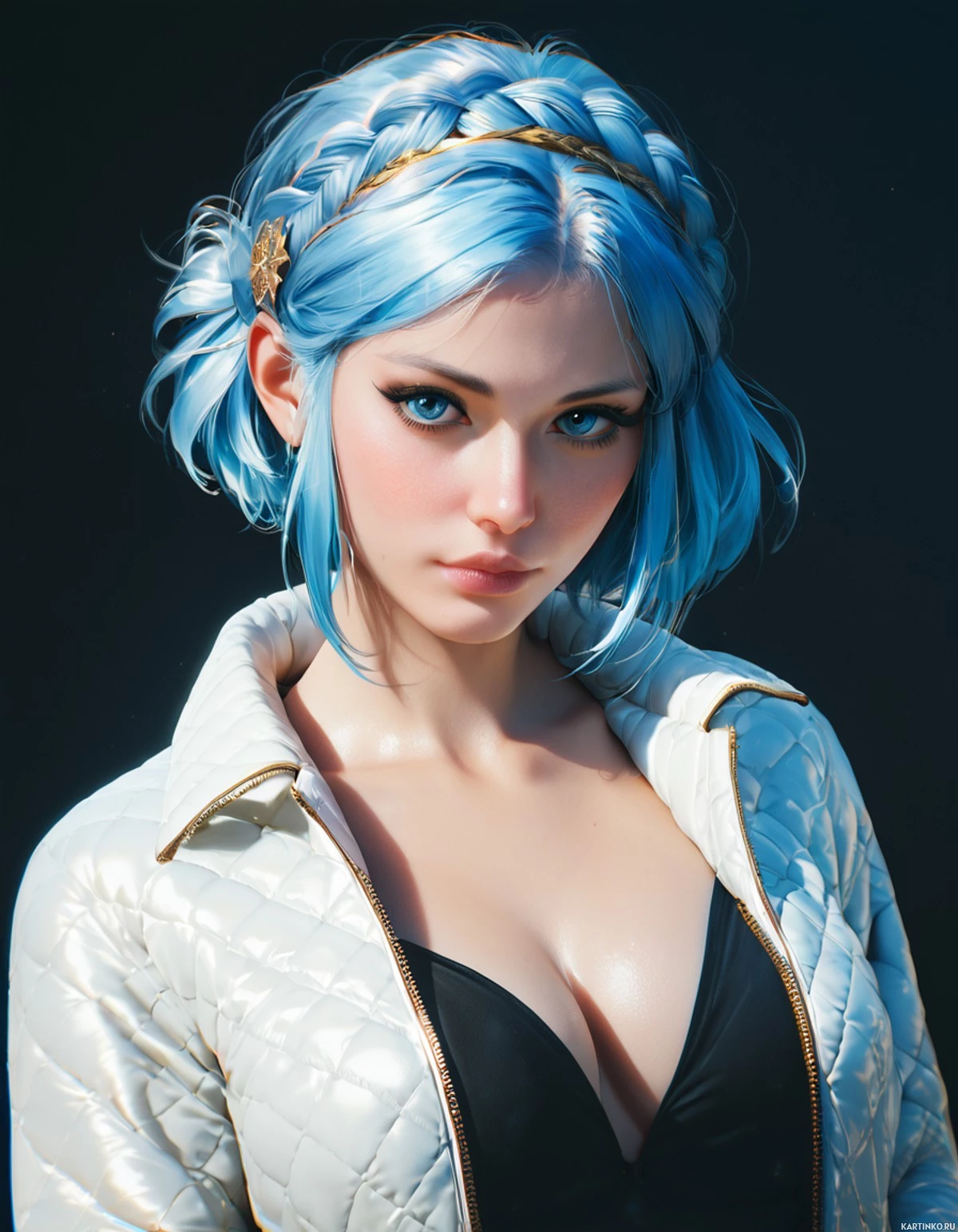 Это цифровая картинка девушки с необычными голубыми волосами, заплетенными в косу и украшенными золотым головным убором. У нее бледная кожа, заостренные уши и спокойное выражение лица. На ней белое пальто поверх черного топа с глубоким вырезом. В её глазах словно играет легкий отблеск, придающий ей безмятежный и задумчивый вид.