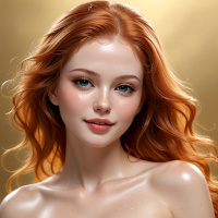 Картинка показывает крупный план портрета женщины со светлой кожей и яркими рыжими волосами. Её взгляд направлен прямо на зрителя, создавая ощущение вовлечённости. На губах лёгкая улыбка, придающая её выражению нежность и задумчивость. Фон выполнен в мягких золотистых тонах, контрастирующих с более прохладными оттенками кожи и волос, создавая тёплую атмосферу. Одежда женщины не видна полностью, что предполагает, что она может быть одета вне кадра или акцент сделан на верхней части тела. На отдельных прядях волос видны тонкие блики, указывающие на свет, падающий сверху, что добавляет картинке мягкости и деликатности. Поза расслабленная, но изящная, одна рука слегка придерживает плечо, придавая композиции непринуждённую, но элегантную нотку. Общее впечатление – нежная утончённость.