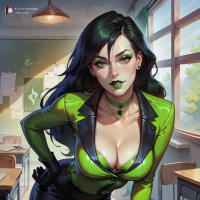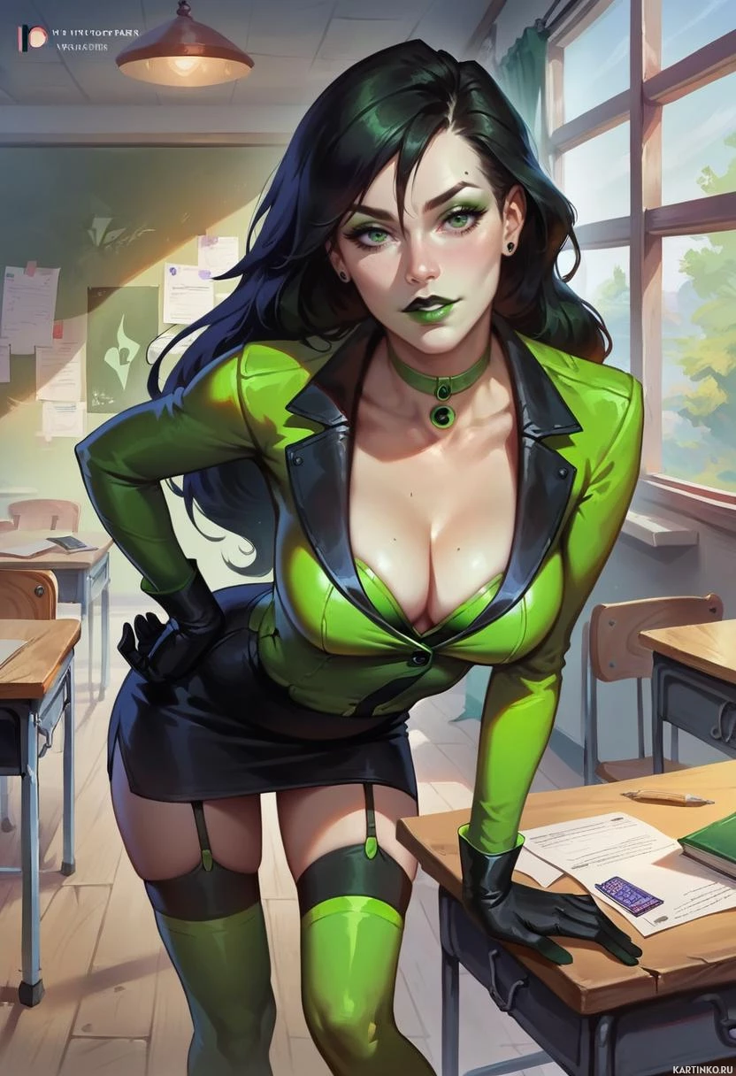 The image depicts a character who appears to be a female with dark hair and a stylized appearance resembling that of a video game or comic book character. She is wearing tight-fitting green body armor, knee high black leather boots, and has a confident posture with one hand on her hip and the other resting on the desk. The background suggests an indoor setting with wooden floors and school furniture, including desks and chairs.
