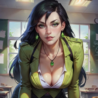 На картинке — стилизованная иллюстрация девушки, выполненная в стиле аниме. У неё тёмные волосы и выразительные зелёные глаза, на лице — серьёзное и задумчивое выражение, она смотрит на зрителя. На ней кожаная куртка поверх футболки с принтом, чёрные брюки и ботинки. Действие происходит, похоже, в классе: позади неё – парты со стульями, а на одной из парт открыта книга. Освещение указывает на дневное время суток в помещении.