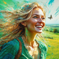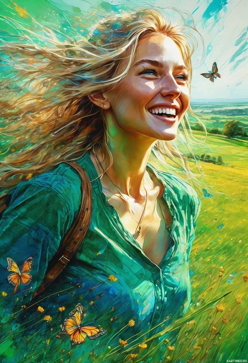 На картинке изображена женщина с длинными светлыми волосами, улыбающаяся чему-то за кадром. На ней зелёный топ, и кажется, она находится в живописном месте, вокруг трава и деревья. Рядом с её лицом порхает бабочка, добавляя картине ощущение сказочности. Цвета мягкие и естественные, подчеркивающие идиллический характер этой фотографии.
