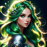 The image depicts a stylized illustration of a female character with vibrant green hair and what appears to be pointed ears, possibly suggesting an elf-like or fantasy theme. She is adorned with a white flower crown on her head and wears a light blue and gold armor over her upper body. The character has large, expressive eyes that are a common feature in digital artwork, often used to convey emotion or add a touch of realism. The overall image has a fantasy-inspired design with soft shading and highlights to give it a three-dimensional appearance.