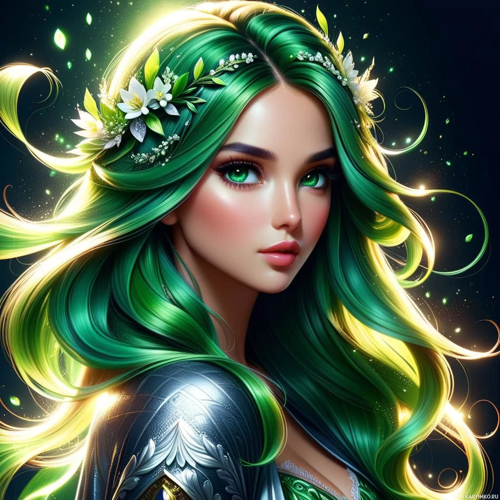 На картинке изображена стилизованная иллюстрация девушки с яркими зелеными волосами и заостренными ушами, что, вероятно, указывает на эльфийскую или фэнтезийную тематику. На голове у нее венок из белых цветов, а верхнюю часть тела украшает легкая сине-золотая броня. У персонажа большие, выразительные глаза – характерная черта цифрового искусства, часто используемая для передачи эмоций или придания реалистичности. В целом, картинка выполнена в фэнтезийном стиле с мягкой светотенью, создающей эффект трехмерности.