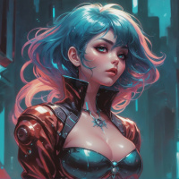The image features a character with striking turquoise hair and an expressive face. She has prominent blue eyes that are looking slightly to the side, giving her a contemplative or introspective expression. Her hair is styled in a way that suggests it's either naturally wavy or she has waves added for aesthetic purposes. The character is wearing a red and black armor with a design that includes what appears to be metal plates and straps, suggesting a fantasy or medieval setting. The armor gives her a rugged yet elegant appearance, which contrasts with the softness of her hair and complexion. Her attire also includes a shoulder piece with a circular emblem or crest, which adds to her warrior-like look. The background is dark and has what looks like technological elements, possibly indicating that this character inhabits a world where technology and fantasy intersect. The overall style of the image is reminiscent of digital art commonly used for video game characters or illustrations in fantasy media.