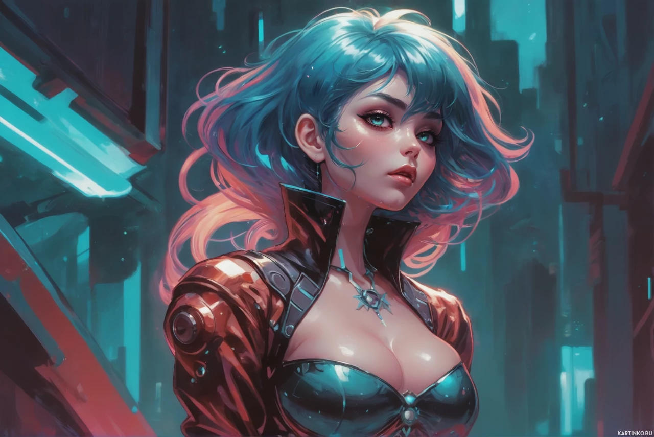 На картинке изображен персонаж с поразительными бирюзовыми волосами и выразительным лицом. У нее большие голубые глаза, взгляд направлен немного в сторону, придавая ей задумчивое или вдумчивое выражение. Волосы уложены таким образом, что создается впечатление, будто они либо естественно волнистые, либо волны добавлены ради эстетики. Персонаж одета в красную и черную броню с дизайном, включающим, кажется, металлические пластины и ремни, что указывает на фэнтезийное или средневековое окружение. Броня придает ей одновременно суровый и элегантный вид, контрастирующий с мягкостью ее волос и кожи. Ее наряд также включает в себя наплечник с круглым символом или гербом, что подчеркивает ее воинственный облик. Фон темный и содержит, как будто, технологические элементы, возможно, указывающие на то, что этот персонаж живет в мире, где переплетаются технологии и фэнтези. Общий стиль картинки напоминает цифровое искусство, которое часто используется для персонажей видеоигр или иллюстраций в фэнтезийных медиа.