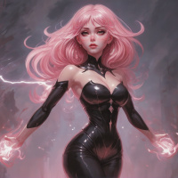 The image depicts a female character with pink hair, dressed in black leather attire. She has her arms outstretched and appears to be casting or manipulating magical energy in the form of sparkles from her hands. The character is set against a dark, moody background that suggests a fantasy or supernatural setting.