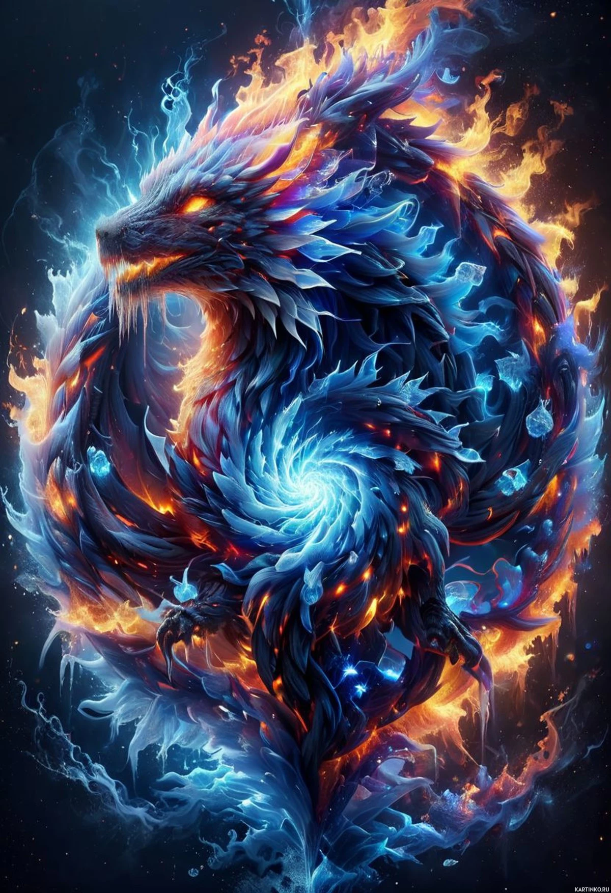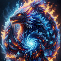 a fantastical dragon depicted in an artistic style. The dragon is coiled and appears to be emerging from or transforming into flames, which suggests it might have the ability to manipulate fire. Its body scales are multicolored, with blues, whites, and hints of other colors that contribute to a mystical or magical atmosphere. The dragon's expression is intense and focused. The artwork is rich in detail and color, showcasing a high