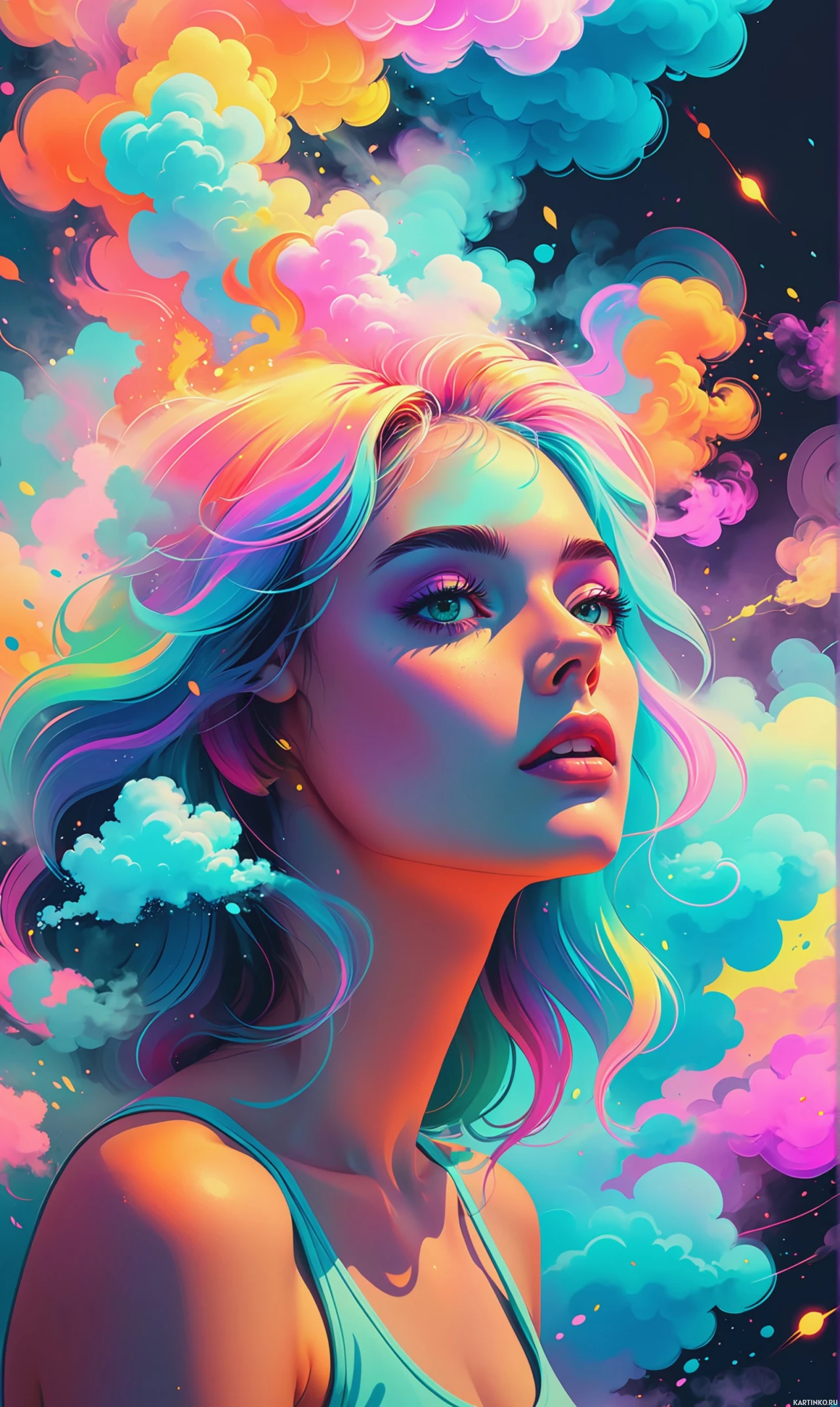На картинке изображена девушка с фиолетовыми волосами на фоне яркой, красочной палитры, напоминающей облака в оттенках розового, оранжевого, голубого, зелёного и жёлтого. У неё спокойное выражение лица, взгляд направлен чуть вверх, губы поджаты. Макияж выполнен в естественном стиле, гармонирующем с цветом её волос.