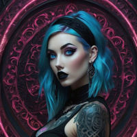 The image features a person with blue hair styled in an asymmetrical manner, with some strands standing out and others blended into the overall color. They have dark eye makeup that accentuates their eyes. There is visible tattooing on their right shoulder, which appears to be detailed and possibly tribal in style. The individual is wearing a sleeveless top with lace details, suggesting a gothic or emo influence in their fashion choice. The background has an ornate design that includes red and black elements, giving the impression of a portal or entrance to another world, enhancing the edgy and dramatic feel of the image. The person is looking directly at the camera with a neutral expression on their face. The overall style and composition of the photo suggest it may be a promotional image for an album, event, or brand related to rock, gothic, or emo subcultures.