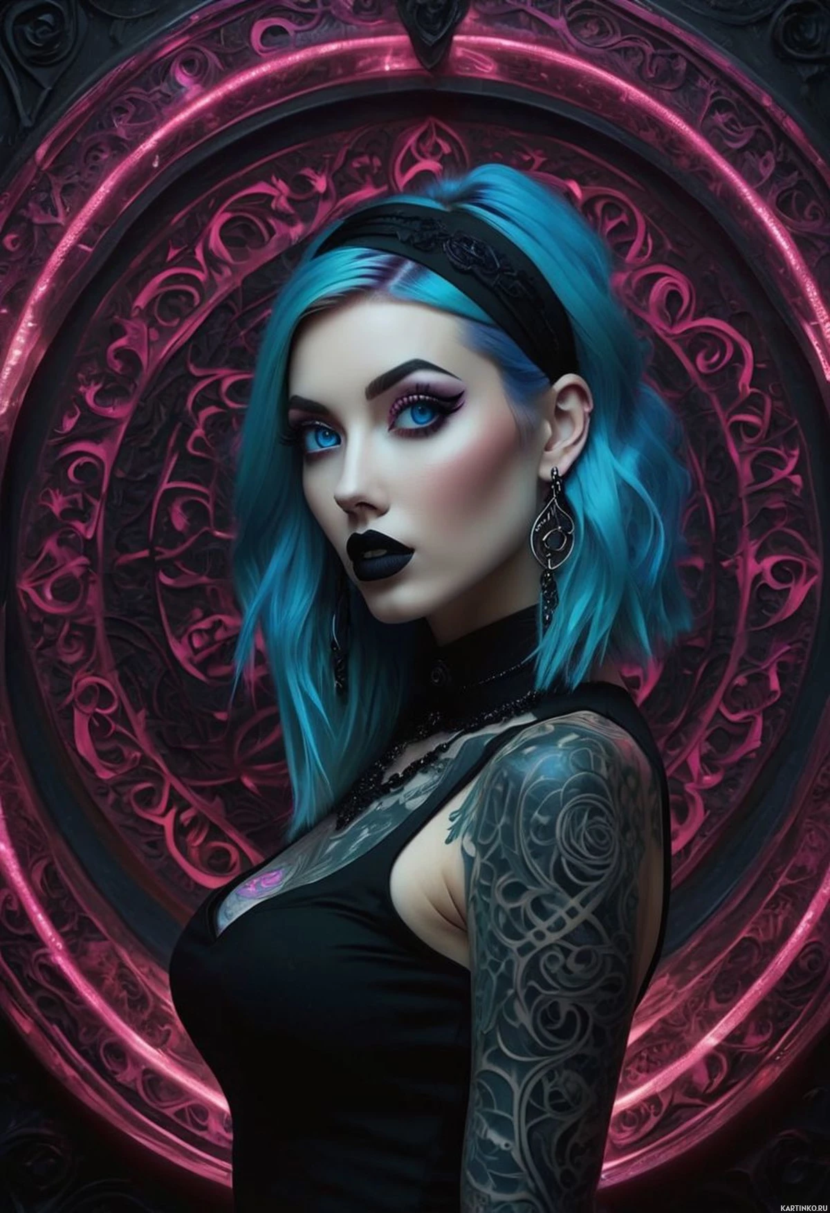 На картинке запечатлён человек с синими волосами, уложенными асимметрично – некоторые пряди вздыблены, другие плавно переходят в общий цвет. Тёмный макияж глаз подчеркивает глаза. На правом плече видны татуировки, выполненные в детальном, возможно, этническом стиле. На человеке – топ без рукавов с кружевной отделкой, что указывает на готический или эмо стиль в одежде. Фон имеет сложный орнамент с красными и чёрными элементами, создающий впечатление портала или входа в другой мир, усиливая дерзкую и драматичную атмосферу картинки. Человек смотрит прямо в камеру с нейтральным выражением лица. Общий стиль и композиция фотографии позволяют предположить, что это может быть промо-картинка для альбома, мероприятия или бренда, связанного с рок-, готической или эмо-культурой.