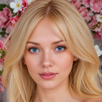 The image features a young woman with light skin and blonde hair, looking directly at the camera. She has a neutral expression on her face. Her eyes are wide open, and she has full lips that are pink in color. Around her neck, there appears to be a garland or flowers arranged in a circular pattern.