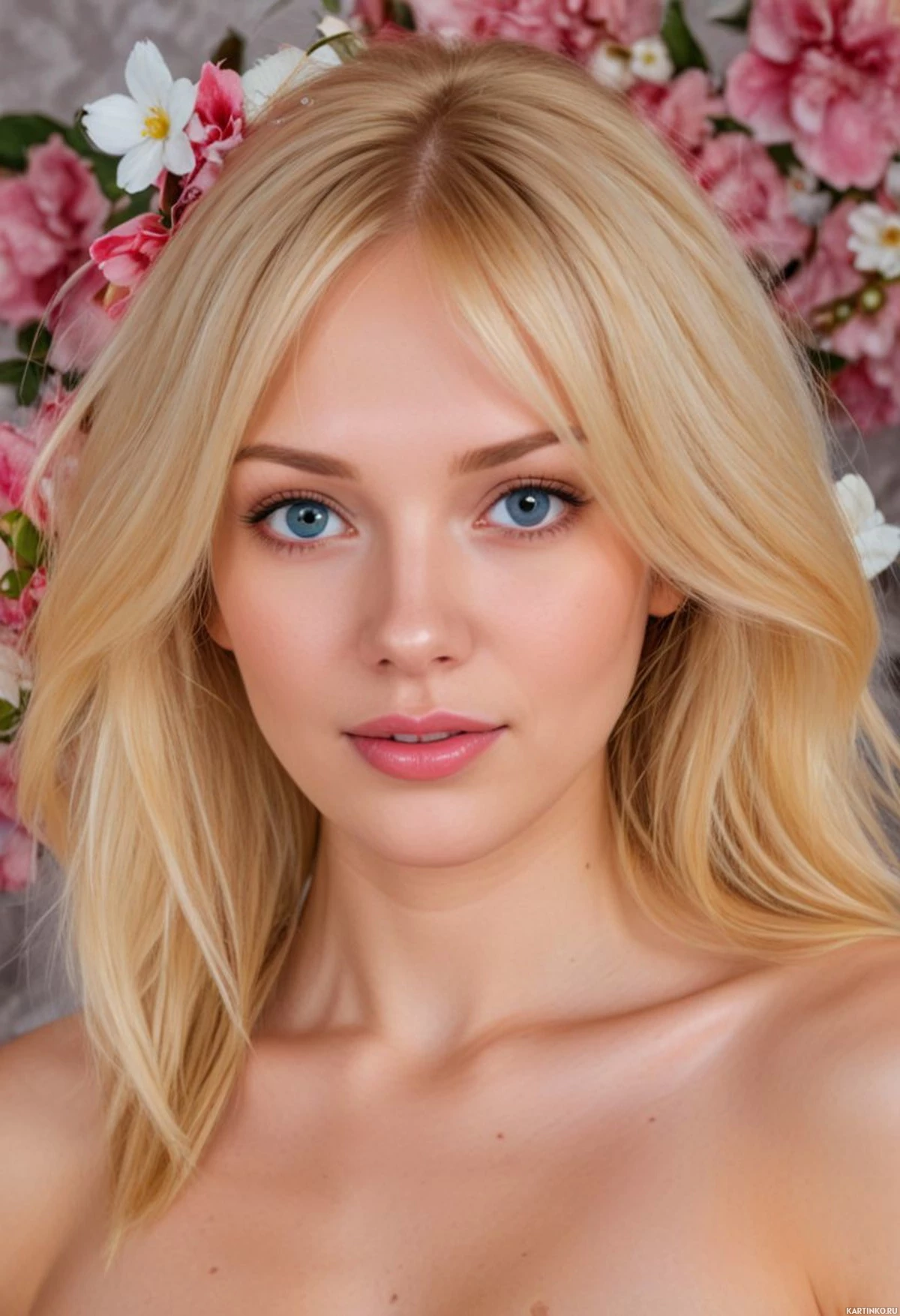 На картинке изображена молодая женщина со светлой кожей и светлыми волосами, смотрящая прямо в камеру. На ее лице – спокойное выражение. Глаза широко открыты, губы полные и нежно-розовые. Вокруг шеи – гирлянда или венок из цветов.