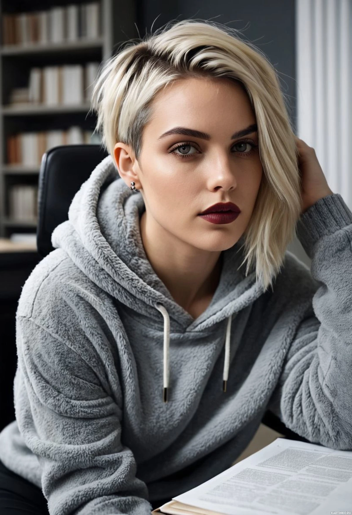 The image shows a young woman with short blonde hair seated at a desk. She has a neutral expression on her face and appears to be looking off to the side, rather than directly engaging with the viewer or camera. Her attire consists of a grey sweatshirt and she is resting one hand on her chin as if deep in thought. The background suggests an indoor setting, possibly an office environment, indicated by the presence of what appears to be a bookshelf with books and other items organized neatly along its edge.