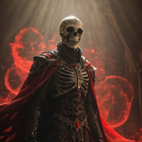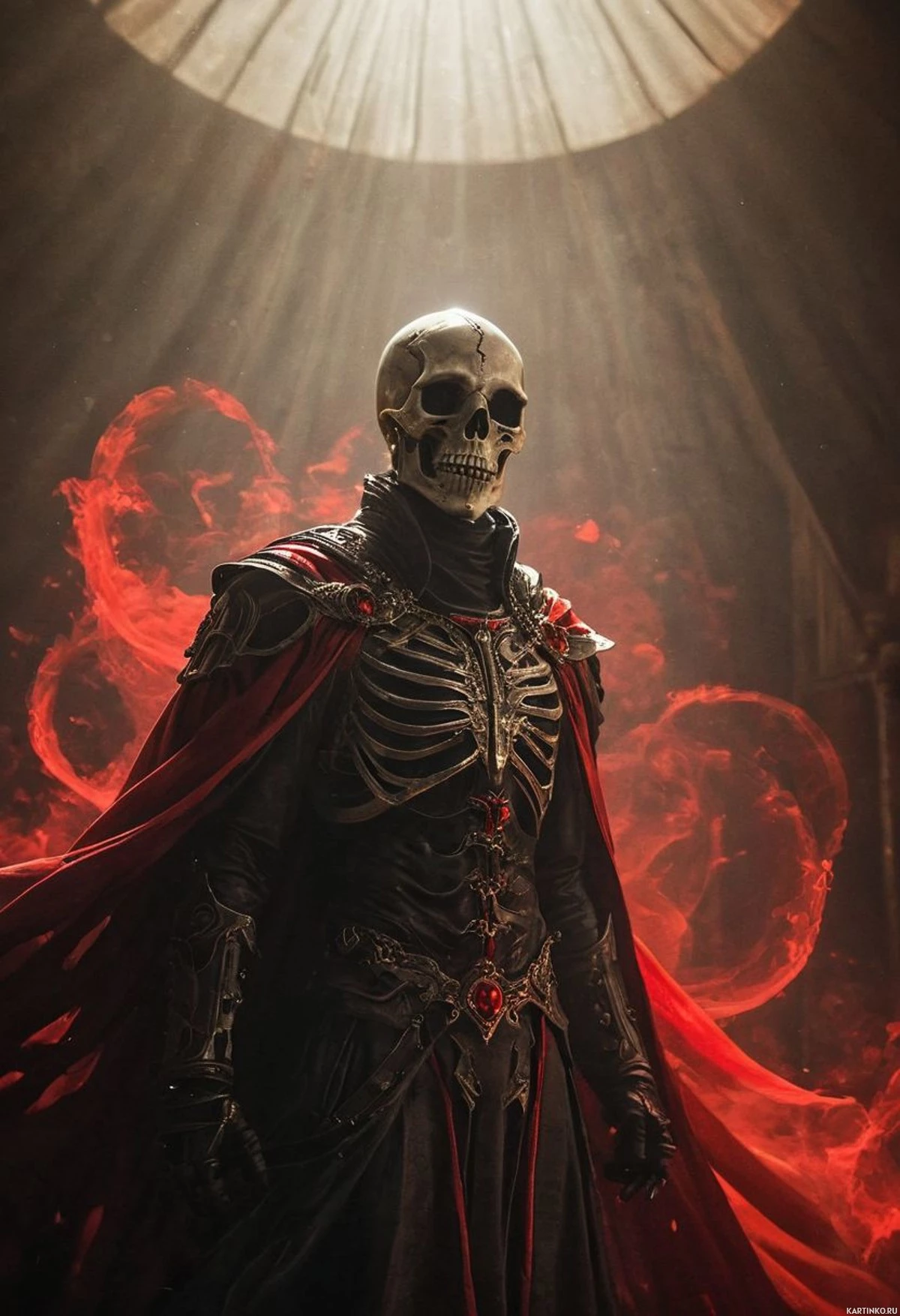 fantasy figure, possibly an antagonist given their skeletal appearance and ominous presence. The use of the word "skull" could imply that this character is associated with death or dark themes within the context of the image.