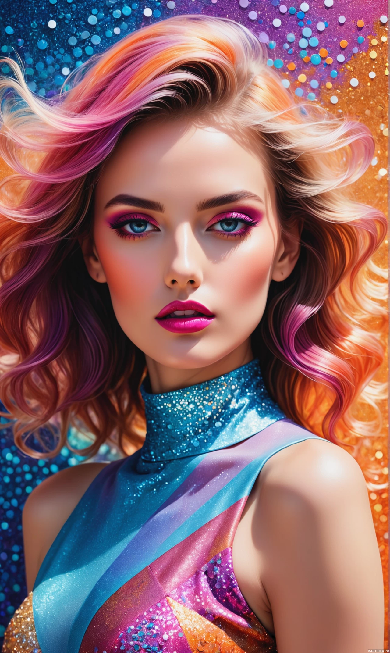 На картинке запечатлена молодая женщина с яркими розовыми волосами, уложенными в небрежные волны, которые едва касаются плеч. У нее эффектный макияж: броский синий блеск на веках и насыщенная красная помада, контрастирующие с бледной кожей. Четкие брови и пухлые губы придают взгляду выразительности. На ней топ без рукавов с высоким вырезом и, кажется, металлизированная текстура в оттенках синего, фиолетового и розового. Создаётся впечатление, что топ покрыт мелкими мерцающими частицами, отражающими свет. Фон создает ощущение нереальности, с вспышками узоров, похожих на звёзды, в оттенках розового, синего и зеленого, что намекает на космическую тематику.