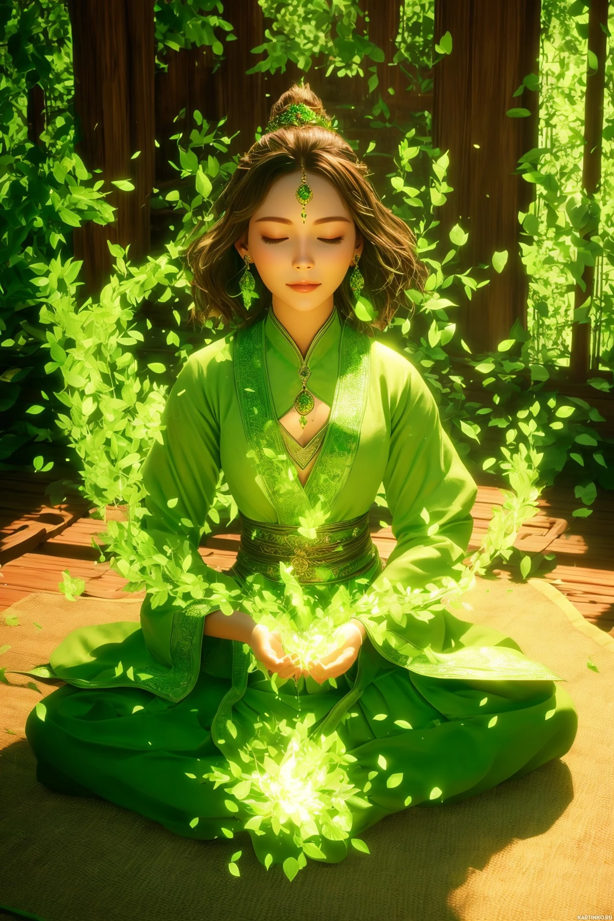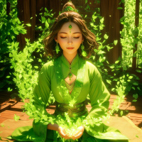 На картинке изображена женщина, принимающая медитативную позу с закрытыми глазами и руками, сложенными в жесте равновесия или концентрации. Она расположена по центру на размытом фоне. На ней традиционная азиатская одежда, вдохновлённая исторической китайской модой. Её причёска – современная интерпретация древнего стиля. От её рук исходит зелёное энергетическое свечение, похожее на магическую ауру, которое поднимается вверх, создавая эффект дыма или частиц. На заднем плане видны растения с широкими листьями.