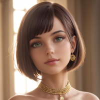 The image features a person who appears to be a young adult female with short hair and fair skin. She has a neutral expression on her face, with her lips slightly parted as if she is about to speak or smile. Her eyes are directed towards the viewer. The individual is wearing what seems to be historical or fantasy-style armor, which includes a corset with gold embellishments and a chest piece that could be part of a breastplate or plate armor design. The armor has intricate details and appears to be shiny, suggesting it might be made from metallic materials such as bronze or steel. The background is out of focus but hints at an interior space with a warm, possibly religious-looking structure that resembles the inside of a chapel or church due to the presence of a stained glass window and architectural details such as arches and pillars. The lighting in the image casts soft shadows on her face, indicating that it may be taken during daylight with natural light coming through the windows. The overall style of the photo suggests a character portrayal, possibly from a fantasy or historical narrative.