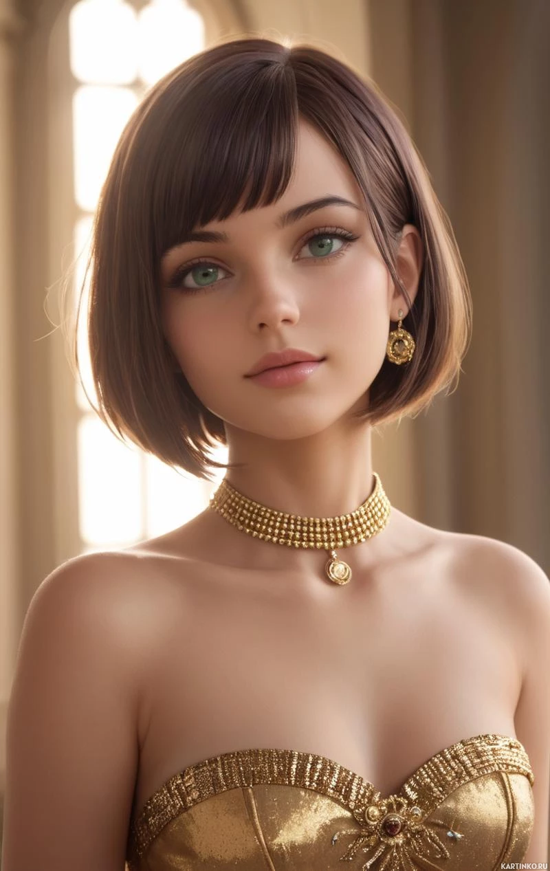 На картинке изображена девушка, вероятно, молодая женщина, с короткой стрижкой и светлой кожей. На её лице спокойное выражение, губы слегка приоткрыты, словно она собирается что-то сказать или улыбнуться. Глаза смотрят прямо на зрителя. На ней доспехи, выполненные в историческом или фэнтезийном стиле – корсет с золотыми украшениями и нагрудник, который может быть частью брони или пластинчатого доспеха. Доспехи отличаются сложной деталировкой и выглядят блестящими, что говорит о том, что они сделаны из металла, например, бронзы или стали. Фон размыт, но намекает на интерьер с теплым, возможно, религиозным сооружением, похожим на внутреннее убранство часовни или церкви, благодаря витражному окну и архитектурным деталям, таким как арки и колонны. Освещение в картинке отбрасывает мягкие тени на лицо, что указывает на то, что фотография сделана при дневном свете, с естественным освещением, проникающим через окна. Общий стиль фото предполагает портрет персонажа, возможно, из фэнтезийного или исторического произведения.