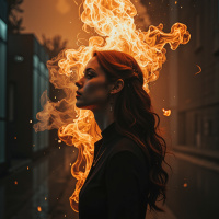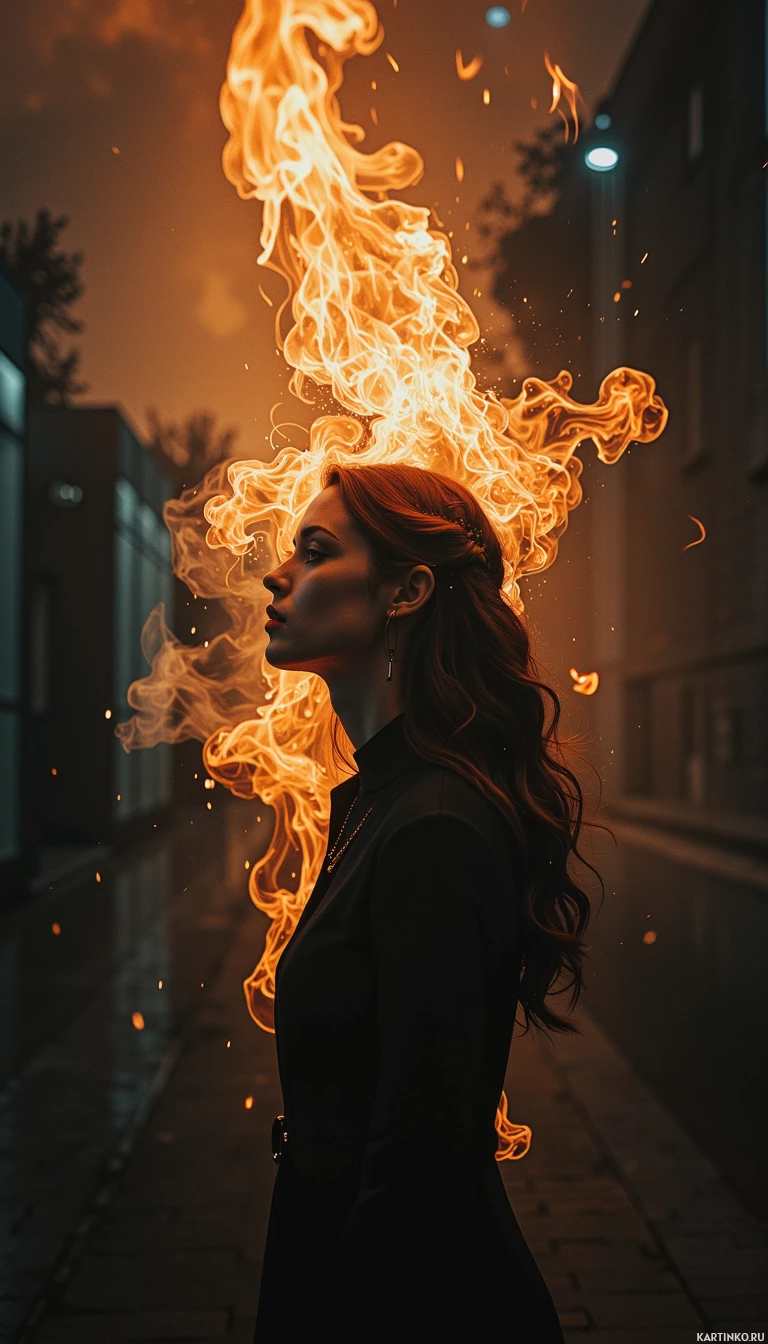 На картинке женщина стоит на ночной городской улице. Её глаза закрыты, голова неподвижна, и из её рта вырываются языки пламени, взмывающие в воздух. Она одета в чёрный наряд с белыми акцентами. Улица вокруг неё мокрая, что говорит о недавнем дожде. Отражающие огни города видны в окнах домов, выстроившихся вдоль улицы.