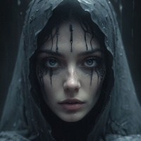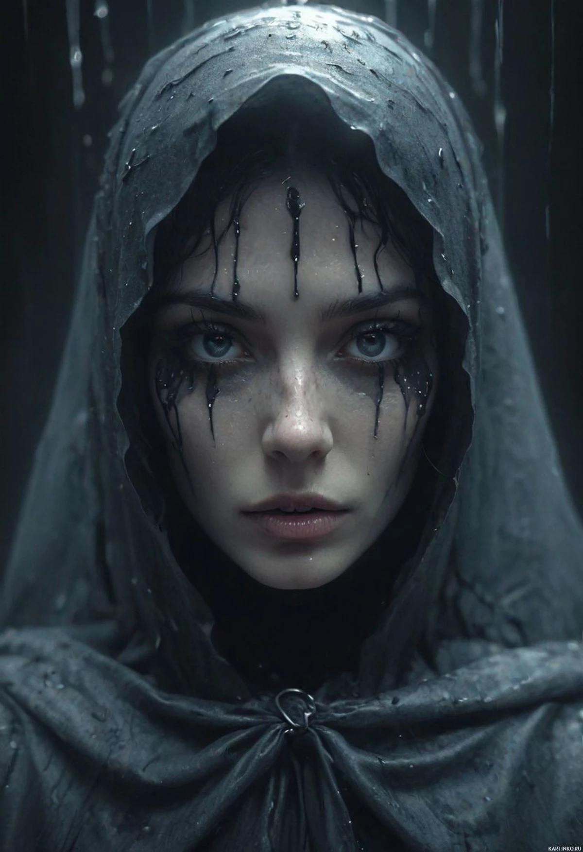 The image features a person with dark hair wearing a hooded cloak. There are visible drips of rainwater on the hood, suggesting recent rainfall or the presence of rain in the scene. The individual has their face partially obscured by the hood, revealing only one eye.