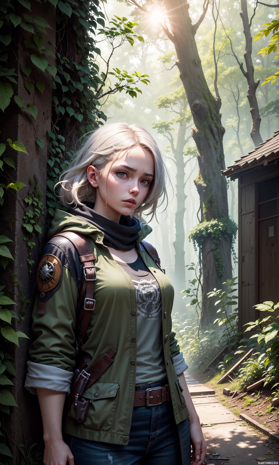 На картинке изображена девушка, стоящая в лесу. У нее светлые волосы, она одета в зеленую куртку, поверх которой надет пояс или жилет, что создает впечатление приключений или активного отдыха. Видны ремни, вероятно, для ношения дополнительного снаряжения. Вокруг нее – деревья и листва, создающие атмосферу тихого, возможно, мистического леса. Освещение похоже на рассвет или закат, с мягким солнечным светом, пробивающимся сквозь листву.