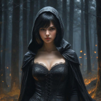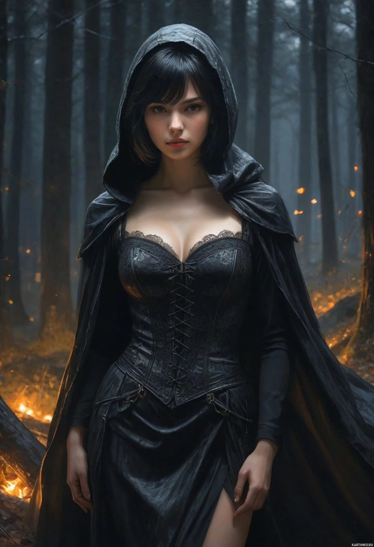 The image depicts a female figure standing in what appears to be a forest setting with trees and ground covered in moss or similar vegetation, indicating a natural environment. She has long, dark hair and is wearing a black cloak with a hood that obscures her face. Underneath the cloak, she has on a corset-style garment. The lighting suggests it might be evening or nighttime due to the ambient glow of what could be firelight in the background.