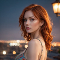 The image features a woman with red hair styled in loose waves. She has a pale complexion and appears to be wearing makeup that enhances her eyes and lips, giving her a subtle dramatic look. Her gaze is directed off to the side, conveying a thoughtful or contemplative expression. She is wearing a sleeveless dress with a high neckline, adorned with floral patterns and possibly embellished with sequins or beads, suggesting a festive or formal occasion. The background consists of dimly lit buildings that suggest an urban setting at night.