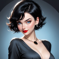 The image depicts a stylized, illustrated character that appears to be a woman with dark hair and