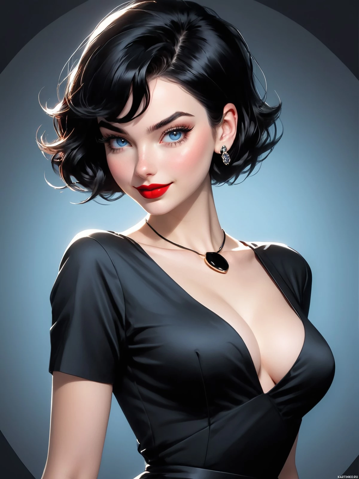 blue eyes. She has a distinctive retro or vintage look, reminiscent of 1950s fashion, with her hairstyle featuring bangs and a side parting, and wearing