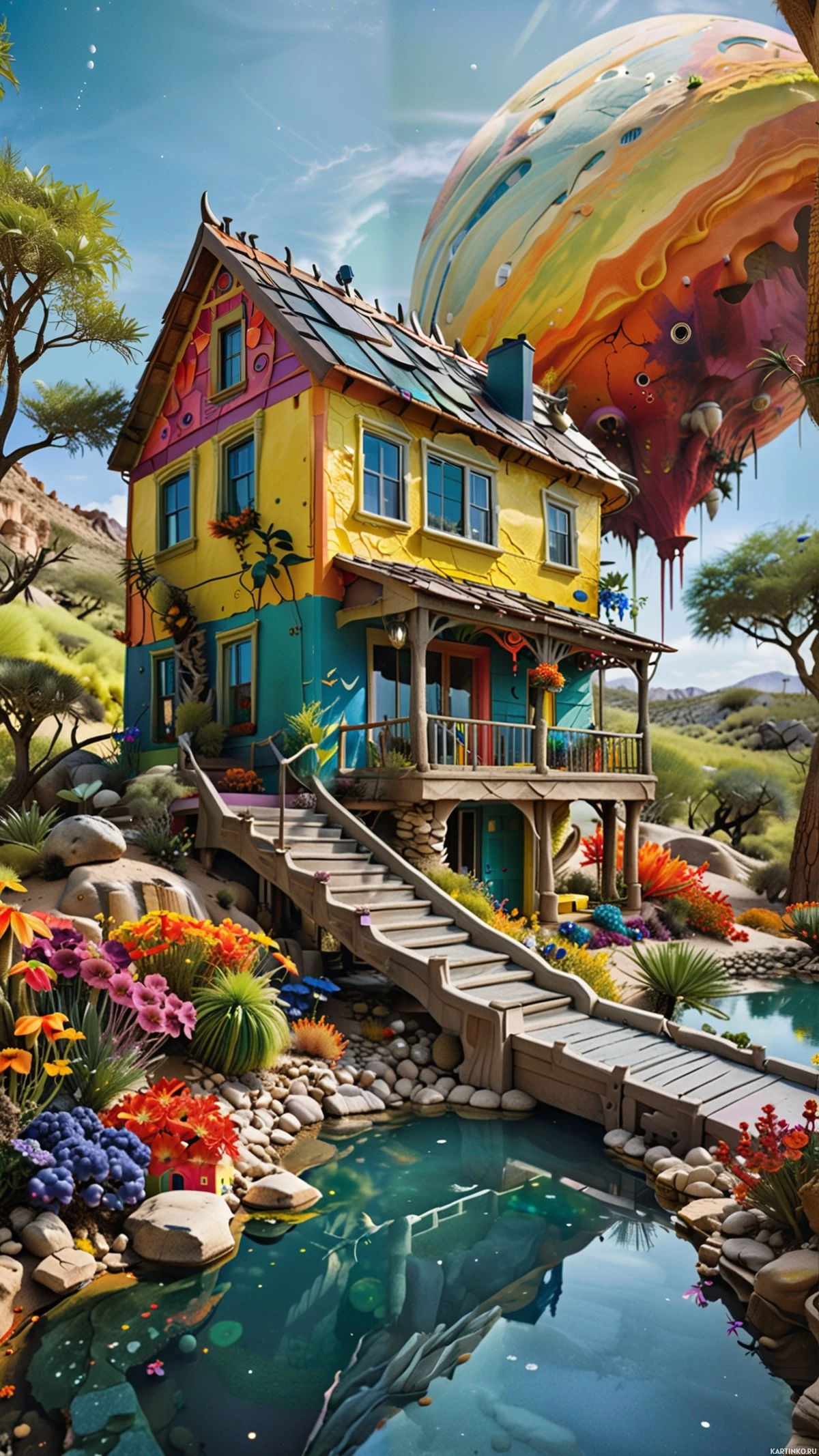 Яркий домик с крутой крышей, утопающий в цветах и зелени, расположенный у небольшого водоема.