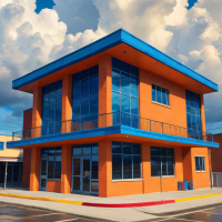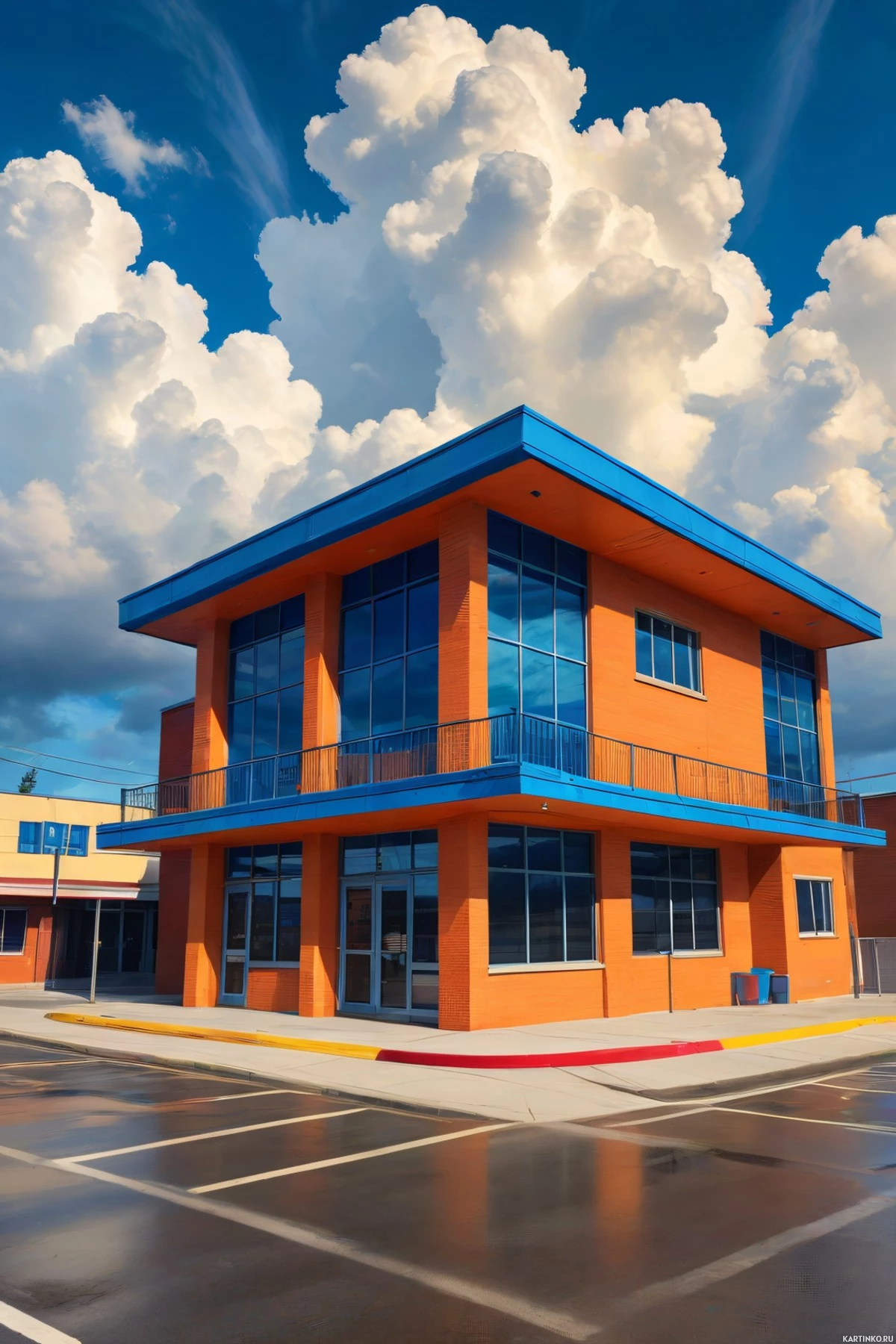 На картинке изображено современное здание, сочетающее разные архитектурные стили. Оно многоэтажное: верхняя часть с голубыми стенами и большими окнами намекает на жилое или коммерческое пространство, а ниже – секция в оранжевых тонах, возможно, первый этаж или нижний уровень. У основания – стеклянные двери, ведущие, вероятно, в магазины или офисы. Над входом расположена небольшая крытая площадка с дополнительными сиденьями и столиками, что создает впечатление зоны отдыха или летнего кафе. Здание завершается синей крышей, повторяющей цвет верхнего этажа. Перед зданием – мощенный тротуар, который выглядит влажным после дождя.