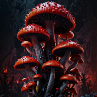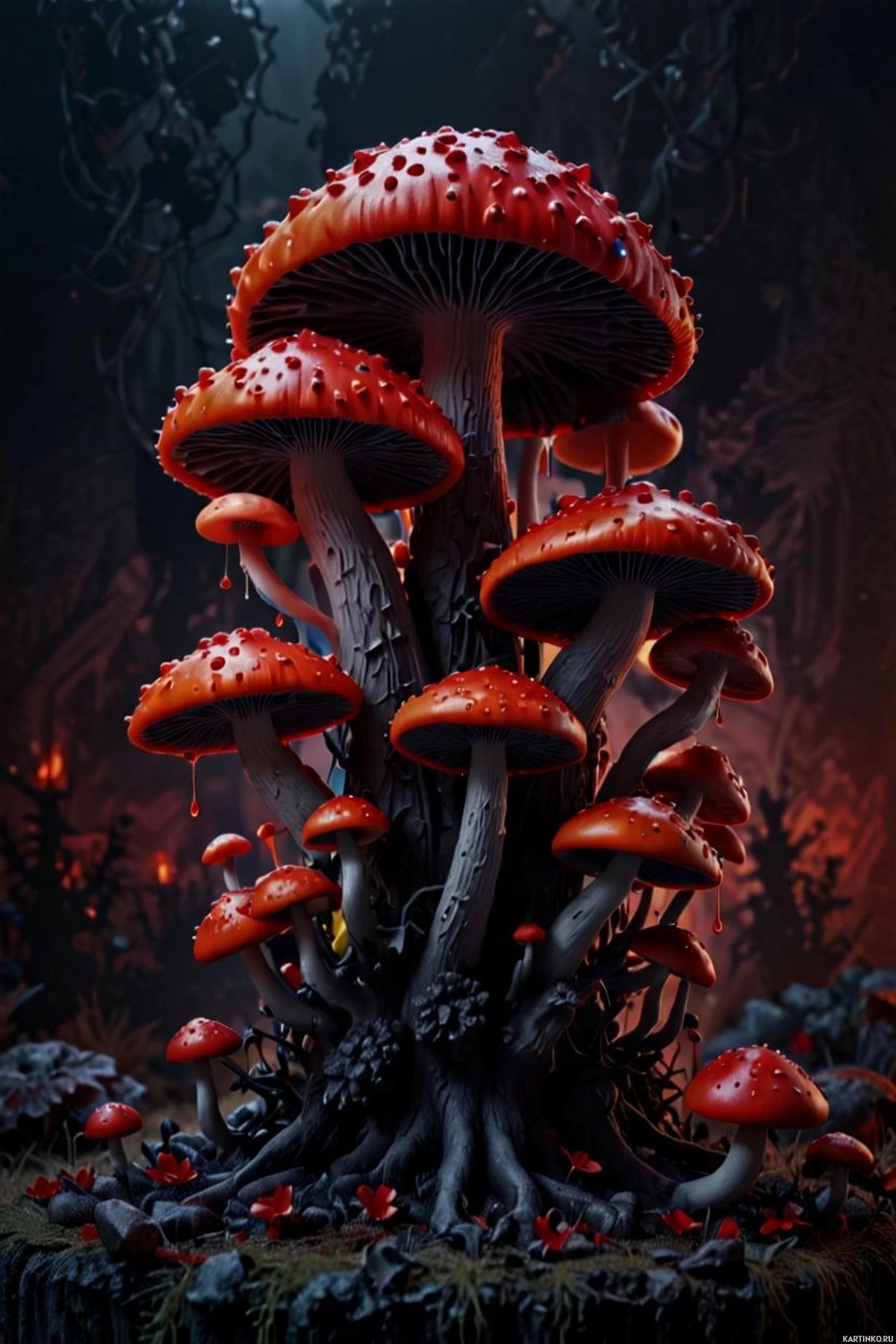 Картинка изображает фантастическую сцену, где изобилие красных грибов растёт из корней центральной древовидной конструкции. Она имеет причудливые ветви и кажется сложенной из переплетённых стволов. Грибы яркие, их шляпки выглядят так, будто только что собраны. Вокруг этой центральной композиции простирается тёмное пространство, напоминающее пещеру или подземное укрытие, где красноватый свет подсвечивает сцену из самой темноты.
