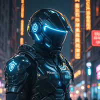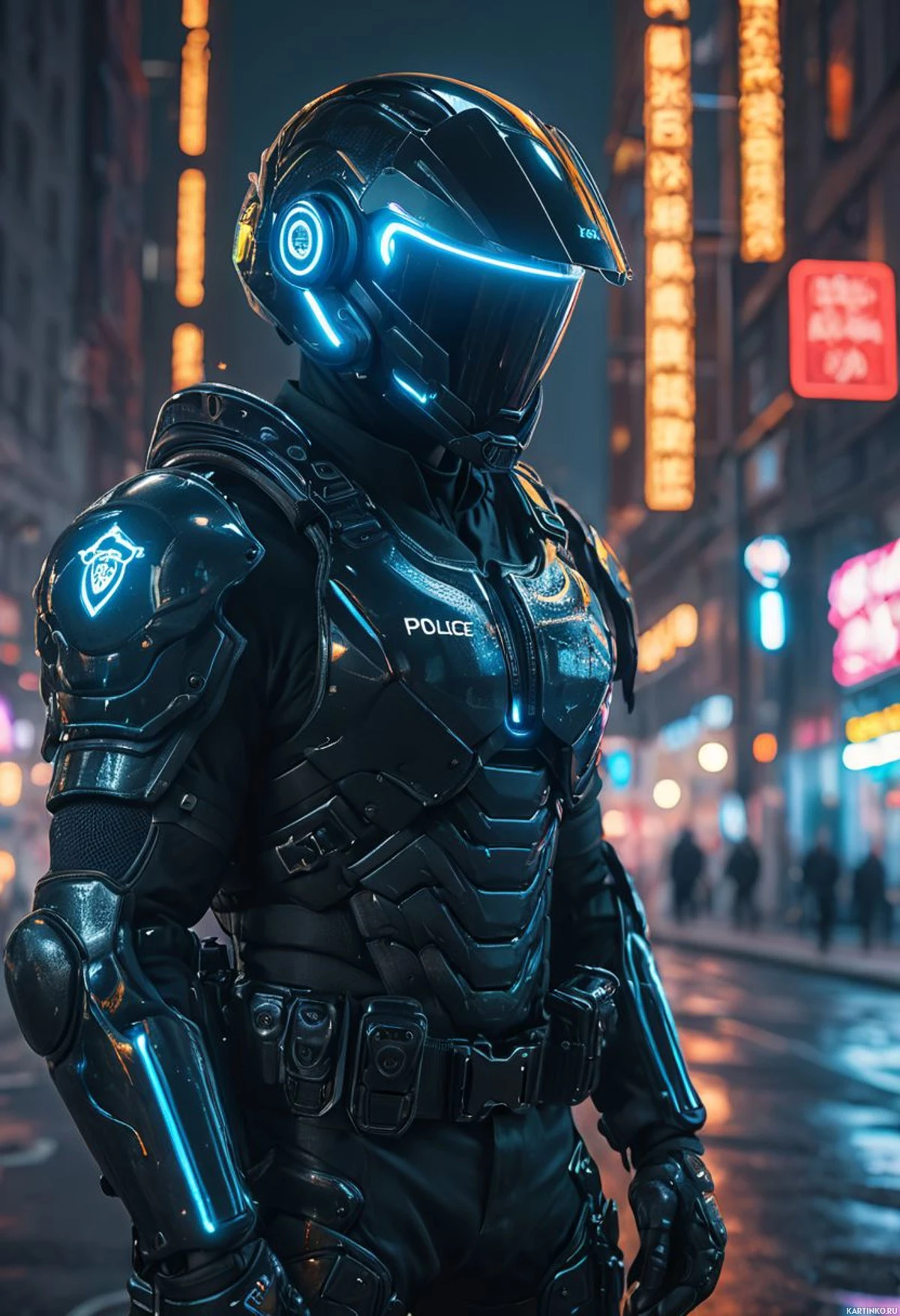 На картинке изображен человек в футуристической броне, напоминающей шлем полицейского из научно-фантастического фильма. Он стоит в городском окружении, окруженный зданиями и вывесками, что указывает на урбанистическую среду.