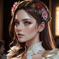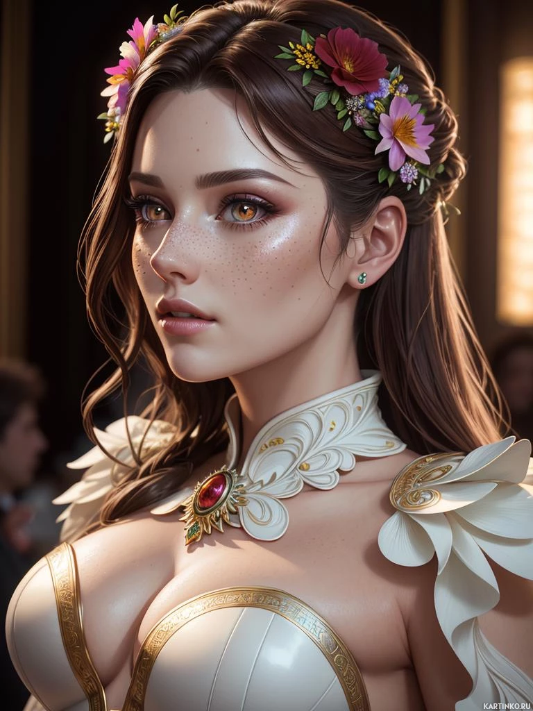 fair skin and is adorned with what seems to be a floral crown on her head, giving her an ethereal or mystical look. Her eyes are gently closed, suggesting a serene or contemplative expression. She is wearing elaborate gold and white armor that includes